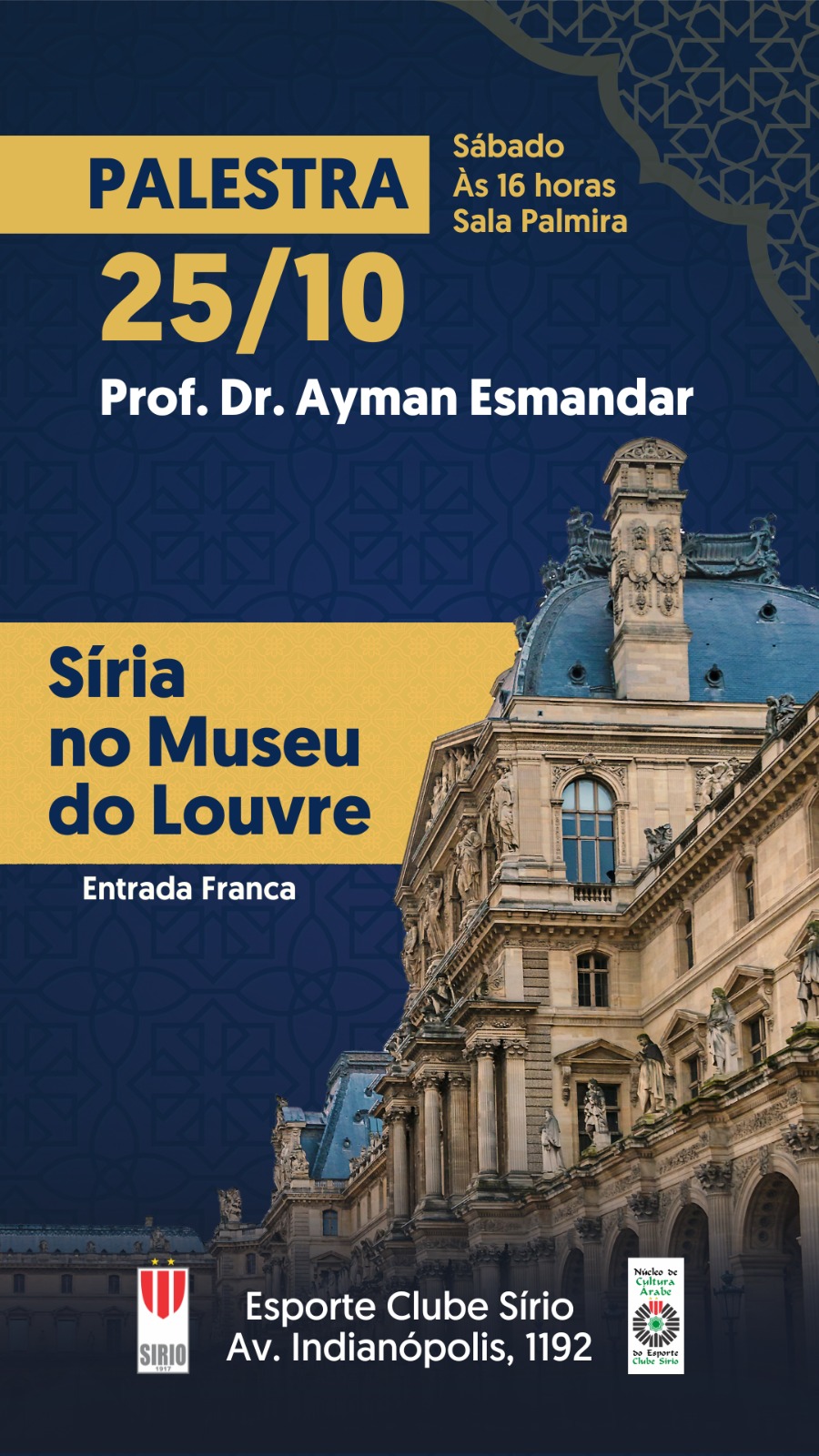 O Esporte Clube Sírio promoverá, no dia 25 de outubro, às 16h, na Sala Palmira, a palestra “Síria no Museu do Louvre”, com o Prof. Dr. Ayman Esmandar. O encontro abordará o legado histórico e cultural da Síria presente no acervo do renomado museu francês.