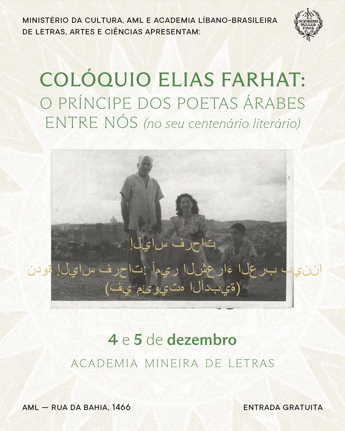 A Academia Mineira de Letras receberá, nos dias 4 e 5 de dezembro de 2025, o Colóquio Elias Farhat: O príncipe dos poetas árabes entre nós — uma celebração do centenário literário do poeta libanês radicado no Brasil, cuja obra construiu pontes entre o Oriente e o Ocidente. O evento, gratuito e aberto ao público, é uma parceria entre a Academia Líbano-Brasileira de Letras, Artes e Ciências e a AML, e contará com conferências, mesas-redondas, exposições e lançamentos. A participação é mediante inscrições prévias neste link.