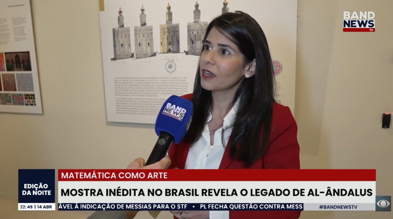 A exposição “Passeio Matemático por al-Ândalus”, promovida pelo ICArabe e pelo Instituto Cervantes, foi destaque na BandNews após sua abertura em São Paulo. Inédita no Brasil, a mostra, que fica em cartaz até 30 de maio, reúne 24 painéis temáticos sobre a presença da matemática em construções históricas da Península Ibérica no período islâmico.