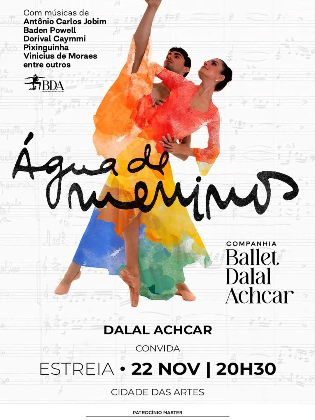 A mestre de balé e coreógrafa Dalal Achcar estreia o espetáculo “Água de Meninos — Fantasia poética em dois atos” na Cidade das Artes, no dia 22 de novembro, às 20h30, na Barra da Tijuca. Com assinatura de Dalal e Eric Frederic, maître de balé da Cia de Ballet Dalal Achcar, o espetáculo reunirá 21 bailarinos para narrar, em movimento, a amizade entre Dalal e Tom Jobim.