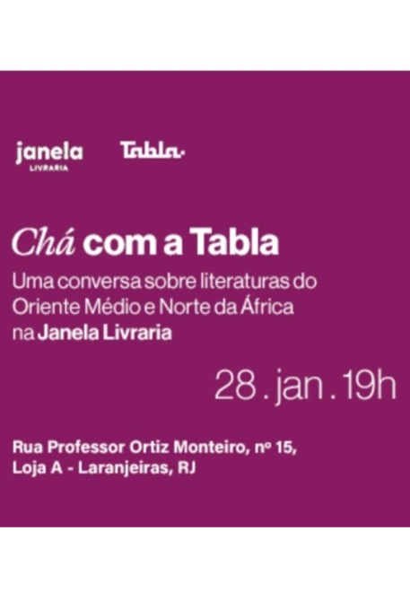 A Editora Tabla promoverá o evento “Chá com a Tabla” no dia 28 de janeiro (quarta-feira), às 19h, na Janela Livraria de Laranjeiras, no Rio de Janeiro. Além do bate-papo com o público, a iniciativa celebra a proposta da Tabla de promover a diversidade literária da Ásia Ocidental e de construir pontes culturais entre países do Sul Global.