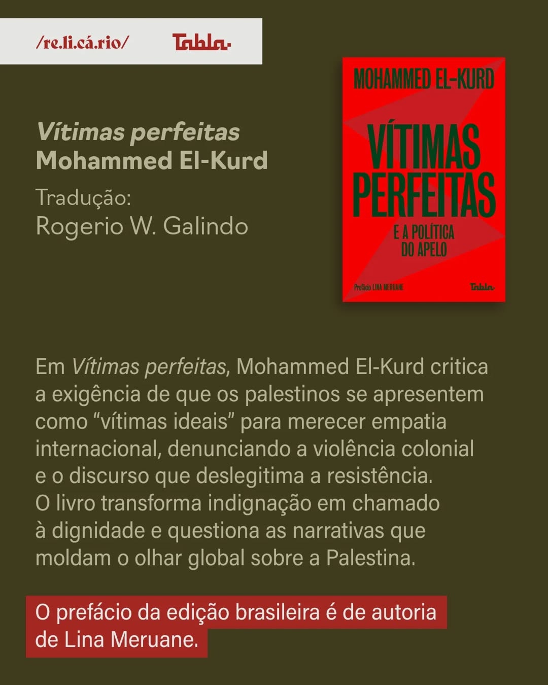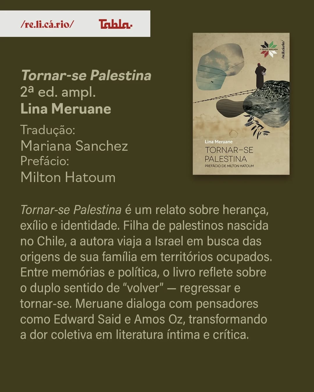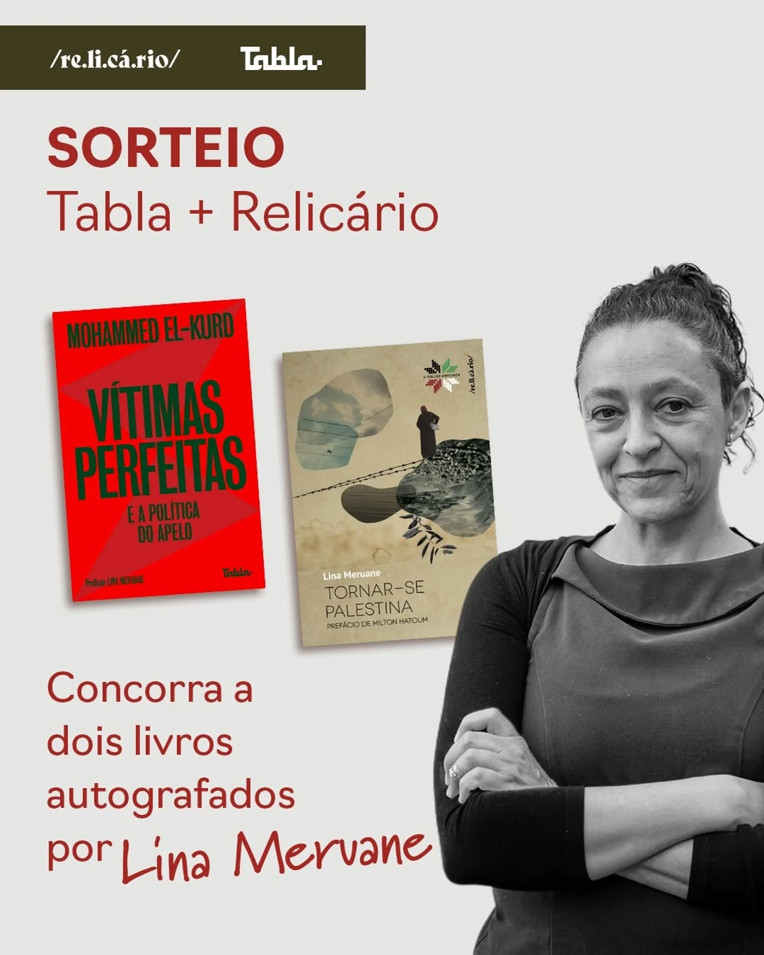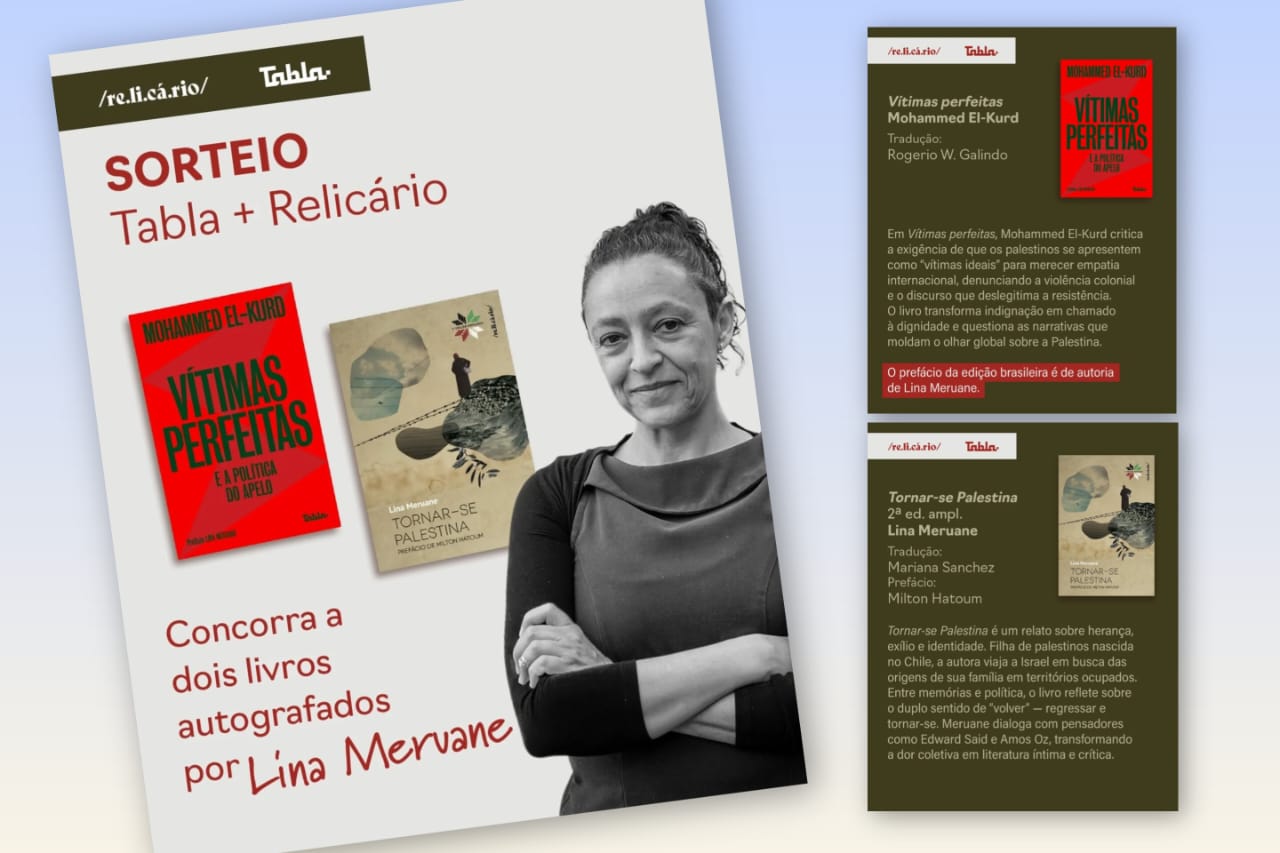 A Tabla e a Relicário realizarão o sorteio de duas obras autografadas por Lina Meruane, autora de “Tornar-se Palestina” (Relicário, 2019), e que assina o prefácio da edição brasileira de “Vítimas perfeitas” (Tabla, 2025), do poeta e jornalista palestino Mohammed El-Kurd. Para participar do sorteio, siga as instruções abaixo: