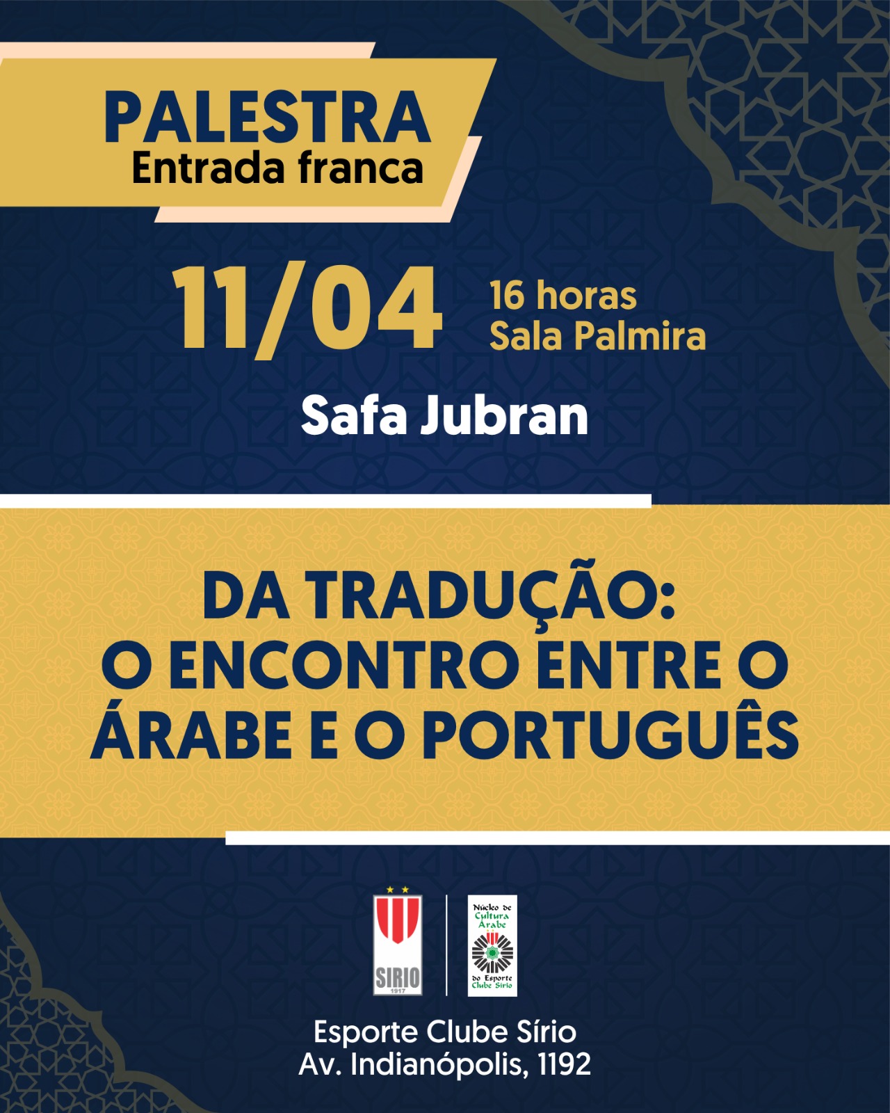 Neste sábado, 11 de abril, o Esporte Clube Sírio realizará a palestra “Da tradução: O encontro entre o árabe e o português”, com a professora e tradutora Safa Jubran, às 16h, na Sala Palmira.